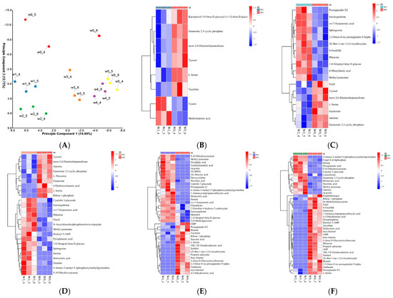 (A) PCA score chart of quality spectrum data from each group of quinoa samples; (B–F) clustering heat maps of differentially expressed metabolites in these quinoa leaves treated with different doses of P2O5. (B) W0 vs. W1; (C) W0 vs. W2; (D) W0 vs. W3; (E) W0 vs. W4; (F) W0 vs. W5.