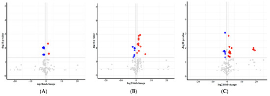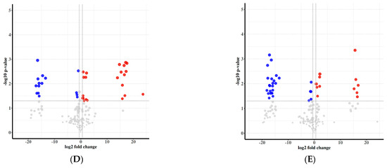 Volcanic maps of the differential metabolites in quinoa leaves treated with different doses of P2O5. (A) W0 vs. W1; (B) W0 vs. W2; (C) W0 vs. W3; (D) W0 vs. W4; (E) W0 vs. W5.