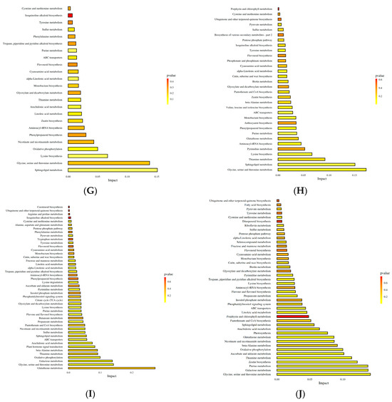 KEGG is the primary public database used to link differentially expressed factors to specific pathways. Using a KEGG analysis, differential metabolites in the W1 vs. W0 group were determined to be enriched in 18 metabolic pathways. Alternatively, differential metabolites in the W2 vs. W0 group were enriched in 24 metabolic pathways, with significant enrichment in the sphingolipid metabolism, purine metabolism, lysine biosynthesis, α-linolenic acid metabolism, and arachidonic acid metabolism pathway. Additionally, differential metabolites in the W3 vs. W0 group were significantly enriched in 32 metabolic pathways, including purine metabolism, sphingolipid metabolism, ABC transporters, lysine biosynthesis, α-linolenic acid metabolism, monobactam biosynthesis, and glycine, serine, and threonine metabolism. Further, differential metabolites in the W4 vs. W0 group were enriched in 46 metabolic pathways, with significant enrichment observed in lysine biosynthesis, α-linoleic acid metabolism, propanoate metabolism, flavone and flavonol biosynthesis, cysteine and methionine metabolism, pyrimidine metabolism, pyruvate metabolism, and arachidonic acid metabolism. Finally, differential metabolites in the W5 vs. W0 group were enriched in 43 metabolic pathways, with significant enrichment in ABC transporters, zeatin biosynthesis, oxidative phosphorylation, linoleic acid metabolism, and thiamine metabolism pathways. The degree of enrichment of these differential metabolites in each pathway is shown in the KEGG enrichment bar chart (Figure 5A–E) and KEGG enrichment bubble chart (Figure 5F–J). Most differentially expressed metabolites detected across all groups were enriched in phenylalanine metabolism, ABC transporters, purine metabolism, thiamine metabolism, and linoleic acid metabolism.