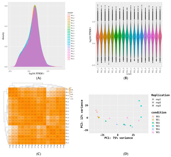 (A) Distribution of FPKM value expression density; (B) violin diagram of FPKM value expression; (C) sample correlation graph; and (D) PCA score chart of quinoa leaves treated with different doses of P2O5.