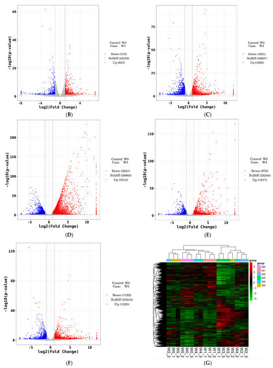 Next, we used DESeq to evaluate the differential expression of genes. The corresponding statistical chart of the differentially expressed gene (DEG) analysis indicated the presence of DEGs between the different comparison groups. Among them, 1152 DEGs were identified in the W0 vs. W1 comparison group, of which 515 were downregulated and 637 were upregulated; 3481 DEGs were identified in the W0 vs. W2 comparison group, of which 1651 were downregulated and 1830 were upregulated; 5562 DEGs were identified in the W0 vs. W3 comparison group, of which 2247 were downregulated and 3315 were upregulated; 2789 DEGs were identified in the W0 vs. W4 comparison group, of which 972 were downregulated and 1817 were upregulated; and 2717 DEGs were identified in the W1 vs. W5 comparison group, of which 1192 were downregulated and 1525 were upregulated (Figure 7A). Further, the volcanic map of these DEGs indicated that the number of upregulated DEGs in W1, W2, W3, W4, and W5, when compared with those in W0, was higher than the number of downregulated genes; this indicated that these DEGs are responsive differential genes that may play an important role in the response of quinoa leaves to different phosphorus fertilizers (Figure 7B–F).