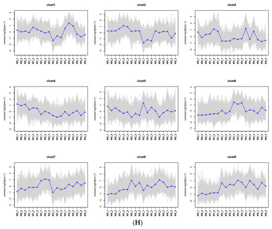 To study the expression patterns of different sample genes under phosphorus-associated stress, we used the R language Pheatmap software package to perform a two-way cluster analysis (Figure 7G). This analysis included assessing the connections between different genes and samples from all comparison groups. Overall, we centralized and standardized the FPKM of genes and divided these genes into different clusters, grouping genes with similar gene expression trends together. The corresponding trend charts (Figure 7H) indicated that the DEGs could be categorized into nine distinct clusters; notably, genes in the eighth and ninth clusters exhibited significant overall changes in expression in the leaves across different phosphorus levels during the filling stage. These findings suggest that these DEGs could serve as potential markers for phosphorus regulation in quinoa.
