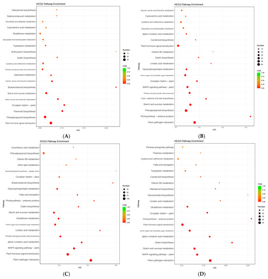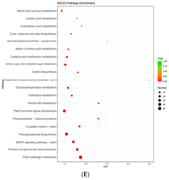 Mapping of DEGs across various metabolic pathways to the KEGG database revealed that these DEGs were enriched in metabolic pathways related to phosphorus metabolism. According to the KEGG enrichment bubble diagram, the metabolic pathways with more DEG enrichment in the W0 vs. W1 comparison group were plant hormone signal transduction, phenylpropanoid biosynthesis, flavonoid biosynthesis, plant circadian rhythms, and valine, leucine, and isoleucine degradation. Alternatively, the metabolic pathways with more DEG enrichment in the W0 vs. W2 comparison group were determined by plant–pathogen interaction; photosynthesis antenna proteins; phenylpropanoid biosynthesis; starch and sucrose metabolism; and cutin, suberine, and wax biosynthesis. The metabolic pathways with more DEG enrichment in the W0 vs. W3 comparison group were established as plant–pathogen interactions, plant hormone signal transduction, MAPK signaling pathway—plant, alpha-linolenic acid metabolism, and pentose and glucuronate interconversions. Additionally, the metabolic pathways with more DEG enrichment in the W0 vs. W4 comparison group included plant–pathogen interactions, MAPK signaling pathway—plant, starch and sucrose metabolism, zeatin biosynthesis, and alpha-linolenic acid metabolism. Finally, the metabolic pathways with more DEG enrichment in the W0 vs. W5 comparison group were determined to be plant–pathogen interaction, pentose and glucuronate interconversions, MAPK signaling pathway—plant, phenylpropanoid biosynthesis, and circadian rhythm—plant (Figure 8A–E).