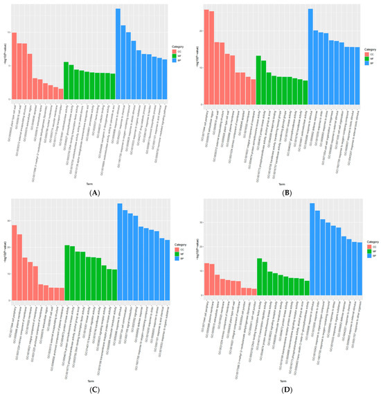 Next, all DEGs were subjected to a GO enrichment analysis using topGO. The GO enrichment analysis results of the DEGs were categorized according to MF, BP, and CC. The top 10 GO term entries with the most significant enrichment were identified in each GO classification (Figure 9A–E). In the W0 vs. W1 comparison group, 3174 significantly enriched GO functions were obtained, including 252 CCs, 741 MFs, and 2181 BPs. In the W0 vs. W2 comparison group, 5597 significantly enriched GO functions were obtained, including 473 CCs, 1287 MFs, and 3837 BPs. Further, in the W0 vs. W3 comparison group, 6973 significantly enriched GO functions were obtained, including 618 CCs, 1533 MFs, and 4822 BPs. Additionally, in the W0 vs. W4 comparison group, 4832 significantly enriched GO functions were obtained, including 392 CCs, 1088 MFs, and 3352 BPs. Finally, in the W0 vs. W5 comparison group, 4579 significantly enriched GO functions were obtained, including 363 CCs, 1075 MFs, and 3141 BPs.