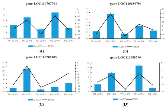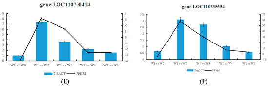 To determine the authenticity and reliability of the transcriptome data and the differential expression levels of candidate genes, we randomly selected 10 genes for RT-qPCR verification. The expression of genes gene-LOC110707704, gene-LOC110700414, gene-LOC110727076, gene-LOC110682410, gene-LOC110727927, and gene-LOC110685810 was consistent with the RNA-seq data, indicating that the transcriptome sequencing results in this study were reliable (Figure 11).