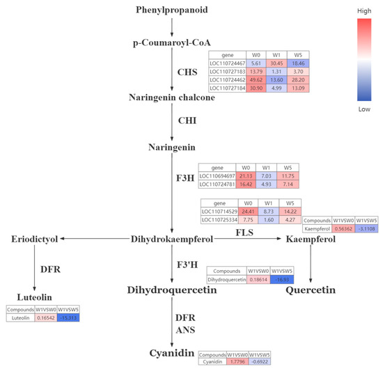 After phenotypic, metabolomic, and transcriptomic analyses, all data of the plants under W5 treatment were established to be significantly different from those of the normal plants. Therefore, we used W5 as a high-phosphorus treatment and W0 as a phosphorus-deficiency treatment; we then used the transcriptomic and metabolomic data to jointly analyze the response mechanism of quinoa leaves to phosphorus fertilizer at the grouting stage. The association heat map shows whether the relationship between metabolites and genes is positive or negative (Figure 12). Simultaneous mapping of metabolites and genes to the KEGG pathway revealed that both genes and metabolites were enriched for flavonoid biosynthesis in both the W0 vs. W1 group and the W5 vs. W1 group.
