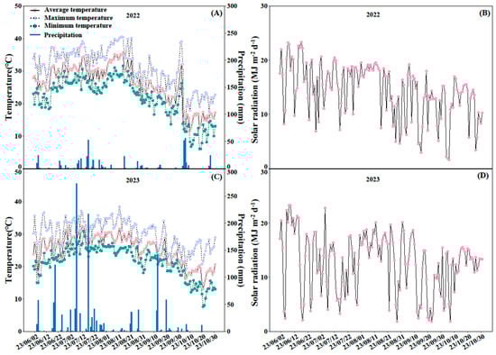 Temperature, precipitation (A,C), and solar radiation (B,D) during the rice growing season in Yangzhou in 2022 and 2023.
