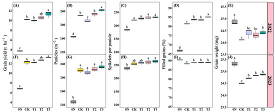 The grain yield and yield components under various N fertilizer application treatments in 2022 (A–E) and 2023 (F–J). Different letters indicate significant differences among treatments (p < 0.05). Treatments: 0N, no N fertilizer applied; CK, urea at the full local standard rate of 270 kg N ha−1; T1, PCU with a reduced rate of 240 kg N ha−1; T2, 70% PCU, 30% urea at a reduced rate of 240 kg N ha−1; and T3, T2 blended with OF at 4500 kg ha−1. N, nitrogen; PCU, polymer-coated urea; and OF, organic fertilizer.
