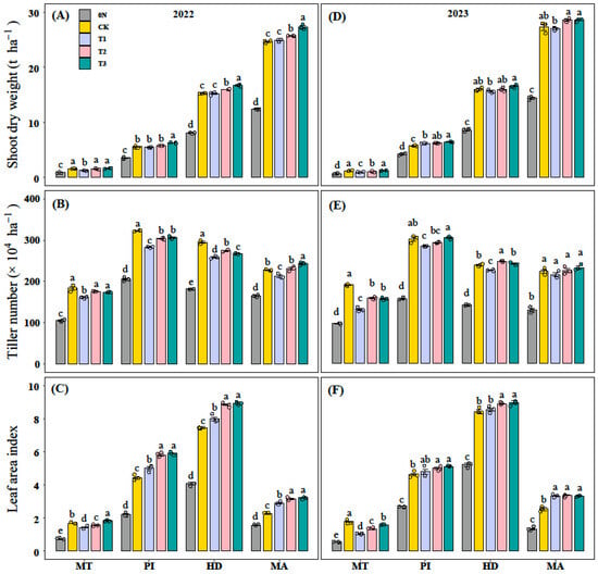 The shoot dry weight (SDW) followed a similar trend across both years (Figure 3A,D). In 2022, only T1 significantly reduced the SDW compared to CK during the middle tillering (MT) stage, while, in 2023, both the T1 and T2 treatments significantly reduced the SDW at this stage (Figure 3A,D). The other treatments either maintained or significantly increased the SDW relative to CK (Figure 3A,D).