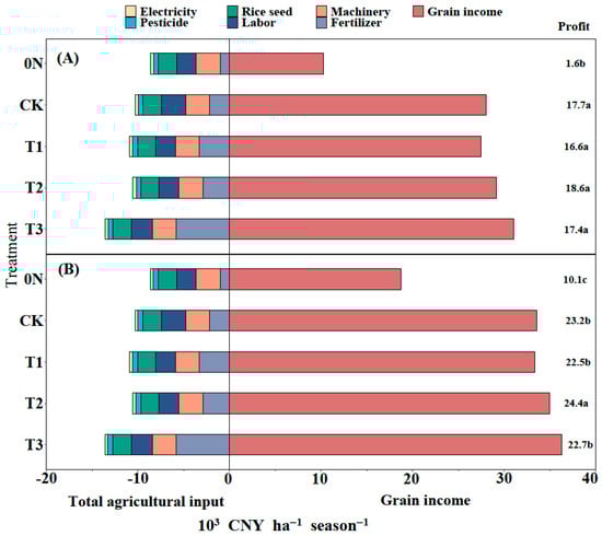 Compared with CK, the T1, T2, and T3 treatments significantly increased the fertilizer input by 1091.3, 724.8, and CNY 3649.8 ha−1 season−1, respectively, while reducing the labor costs by CNY 480, 480, and 360 ha−1 season−1, respectively (Figure 4). The yield differences among the N treatments led to differences in yield income. Compared with CK, the yield income across two years decreased by CNY 336.87 ha−1 season−1 in T1, increased by CNY 1271.9 ha−1 season−1 in T2, and increased by CNY 2894.4 ha−1 season−1 in T3 (Figure 4). Taking into account both agricultural inputs and yield income, the T2 treatment had the highest profit, followed by CK, T3, and T1, but there was no significant difference among the four N application treatments (Figure 4). The 0N treatment had the lowest profit due to its lower yield income (Figure 4).