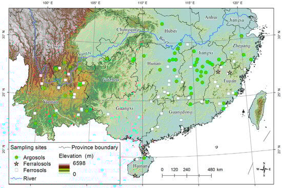 This study was conducted in South China, mainly south of the Yangtze River (Figure 1) (17°30′ N to 34°29′ N and 95°24′ E to 124°11′ E), covering approximately 1.7 million km2. The climate is predominantly subtropical, characterized by hot and humid summers and mild winters. The mean annual precipitation (MAP) is 1415 mm, with a mean annual air temperature (MAT) of 17.9 °C [40]. The soil temperature and moisture regimes are mainly thermic and udic and perudic, respectively. The most widely distributed land cover in this area is forest (51.2%), followed by grassland (26.3%) and cropland (18.9%) [41]. This area is rarely affected by dust deposits from northwestern regions [42], and the main soil types are Ferrosols (48.7%), Argosols (22.9%) and Cambosols (20.6%) according to CST [6]. The statistics of main soil types based on soil maps [41] are shown in Table 1. Ferrosols are mainly referred to as Ultisols, Alfisols and Inceptisols in ST and as Acrisols, Lixisols, Plinthosols and Nitisols in WRB. Argosols can be mainly referred to as Alfisols or Ultisols in ST and as Luvisols, Lixisols, Acrisols or Alisols in WRB, and Cambosols can be mainly referred to as Inceptisols in ST and as Cambisols in WRB. The main parent materials in this area are clastic (42.0%) and calcareous sedimentary rocks (29.4%). The values of the aforementioned environmental variables were obtained from a national dataset in [32,41]. The soil-forming environments may lead to notable changes in soil physicochemical properties in acidic soils, which makes this area ideal for investigating the CECsoil and CECclay relationship.