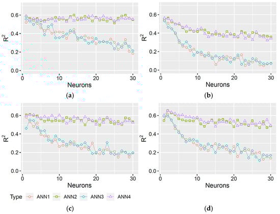 R2 values of ANN models with one hidden layer for dataset 1 (a), 2 (b), 3 (c) and 4 (d), of which the number of neurons of hidden layer ranged from 1 to 30. ANN1 and ANN2 refer to the resilient backpropagation algorithm with weight backtracking using the hyperbolic tangent and logistic sigmoid activation functions, respectively. ANN3 and ANN4 refer to the resilient backpropagation algorithm without weight backtracking using the hyperbolic tangent and logistic sigmoid activation functions, respectively.