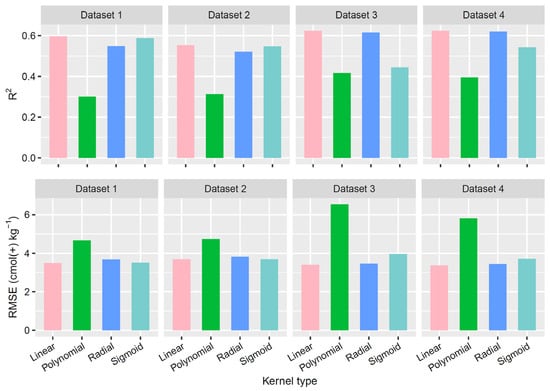 SVR models based on the linear kernel function outperformed SVR models based on the other three kernel types in terms of greater R2 and lower RMSE values (Figure 7), which suggested that a linear decision boundary benefited the separation of feature points. It was inferred that the relationships between the CECclay and covariates could well be quantified by linear regression.