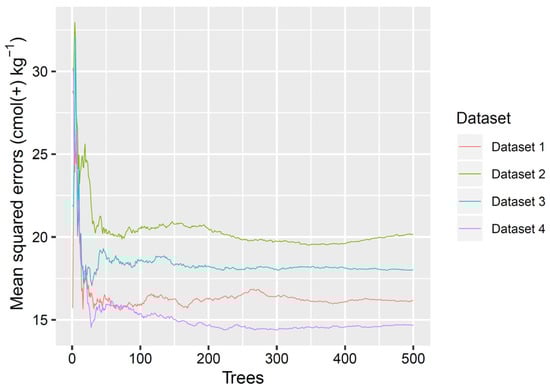 The mean squared errors of RF models rapidly decreased with increasing numbers of trees from 1 to 50 (Figure 8). The errors became relatively stable from 50 to 300, even if some fluctuations could be observed when the number of trees was greater than 300. Thus, the number of trees in the RF models was set to 300.