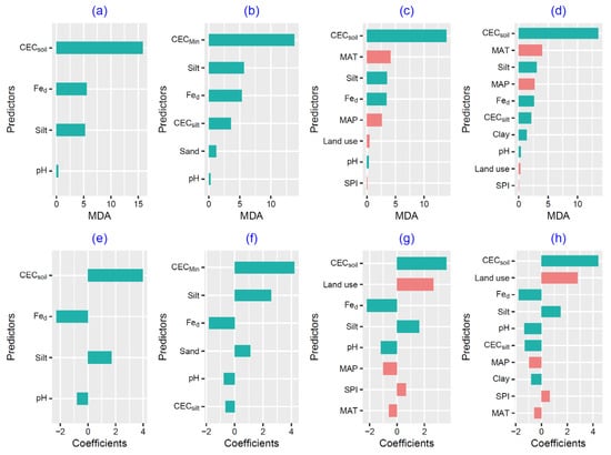 Relative importance of the employed covariates for datasets 1 (a,e), 2 (b,f), 3 (c,g) and 4 (d,h). The values of the mean decrease in accuracy (MDA) (a–d) were derived from RF models. The regression coefficients (e–h) were calculated by MLR models. Bars in sea green and red denote the soil properties and environmental variables, respectively. Land use is a dummy variable representing the presence or absence of upland. CECMin: CEC of mineral fractions (<2 mm); CECsilt: CEC of the silt fraction; CECsoil: CEC of the fine earth fraction (<2 mm); Fed: concentration of free iron oxides; MAP: mean annual precipitation; MAT: mean annual air temperature; SPI: stream power index.