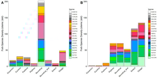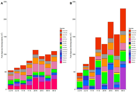 Experiment 2 total forb species density and species composition in relation to seeding rate treatments (2.2, 11, 28, and 56 kg/ha) and cold stratification (N = no stratification, S = stratified). (A) Experiment established in 2021; (B) experiment established in 2022. Codes for forb species are listed in Table 3.