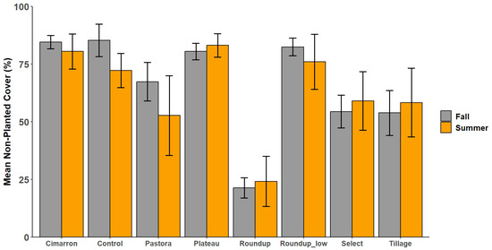 Results from linear mixed-effect regressions are shown in Table 5. While many treatment-by-planting-date interactions were noted, some general trends can be summarized. Summer-sown plots treated with the full rate glyphosate showed the greatest forb stem density (200 stems/m2) and species richness (14) compared with other treatment × season combinations (Figure 1). Forb establishment was more consistent across most fall-sown treatments. Plots that were either tilled (stem density, 134/m2) or had received Select herbicide (stem density, 116/m2) also established well and had comparable levels of sown species richness (Figure 1). Cimarron/metsulfuron and Pastora/nicosulfuron herbicide treatments were ineffective in facilitating forb establishment regardless of planting date. The full-rate Roundup/glyphosate treatment was most effective (p < 0.05) at reducing the existing grass vegetation originally present in plots (Figure 2).