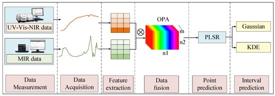 To address these limitations, there is a growing interest in developing innovative methods for assessing soil properties through the fusion of multi-sensor data combined with machine learning algorithms. Numerous studies have demonstrated the effectiveness of using multi-source data within fusion networks to enhance the accuracy of soil property predictions. For instance, combinations of remote sensing data with spectral data, spectral data with image data, and LIBS with MIR spectral data have all shown promise in improving predictive outcomes [31,32,33]. These advancements provide a new direction for the assessment of soil properties. Consequently, it is essential to investigate the fusion methods of multi-source spectral data to maximize the potential of near-field soil sensing technologies for accurate soil property estimation. On the one hand, many of these approaches primarily focus on point predictions for individual properties, which limits their ability to comprehensively evaluate multiple key properties simultaneously [34,35,36,37]. Furthermore, there is a notable lack of research on interval prediction methods in this context. Unlike traditional point estimation, interval prediction generates a range of upper and lower limits for property values, which better reflects the inherent uncertainty and variability of soil properties [38]. This approach leverages established chemometric methods to enhance prediction reliability within a comprehensive interval modeling framework, as demonstrated in prior studies by Rodionova and Pomerantsev [39,40]. By broadening the traditional model application, this method accounts for greater variability, which is particularly beneficial in agricultural and environmental research [39]. Currently, most applications of interval prediction are concentrated in fields such as photovoltaic energy generation and water demand forecasting, with relatively few studies addressing the interval prediction and evaluation of soil property levels [41,42]. This gap presents an opportunity for further research to explore how interval prediction techniques can be effectively adapted and applied to soil property assessments. On the other hand, machine learning represents a pivotal component within the realm of multi-source data fusion technology. Models like partial least square regression (PLSR), random forest (RF), support vector machine (SVM), and deep learning (DL) exemplify the potential of amalgamating diverse data streams to enhance the precision and efficacy of property predictions [31,34,43,44,45]. These methodologies offer a sophisticated framework for synthesizing heterogeneous data inputs, thereby elevating the granularity and reliability of soil property estimations. Despite the substantial progress made in leveraging machine learning for multi-source data fusion, considerable opportunities for advancement remain, particularly in the area of point-to-interval prediction of soil property [46]. The transition from singular data points to comprehensive prediction intervals remains a frontier where further refinement and innovation are warranted.