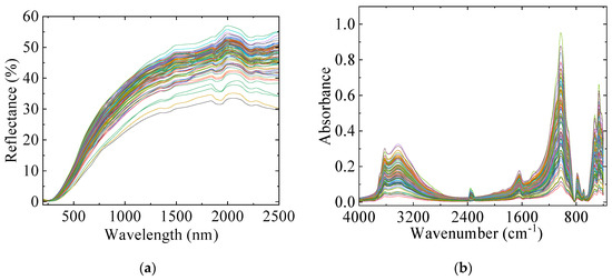 UV-Vis-NIR and MIR reference spectral curves of soil samples: (a) UV-Vis-NIR; (b) MIR.