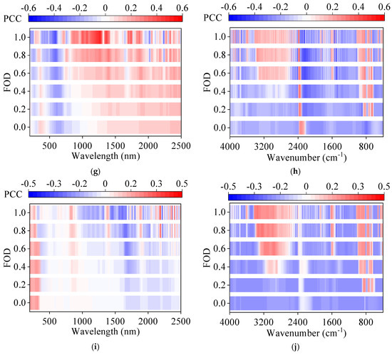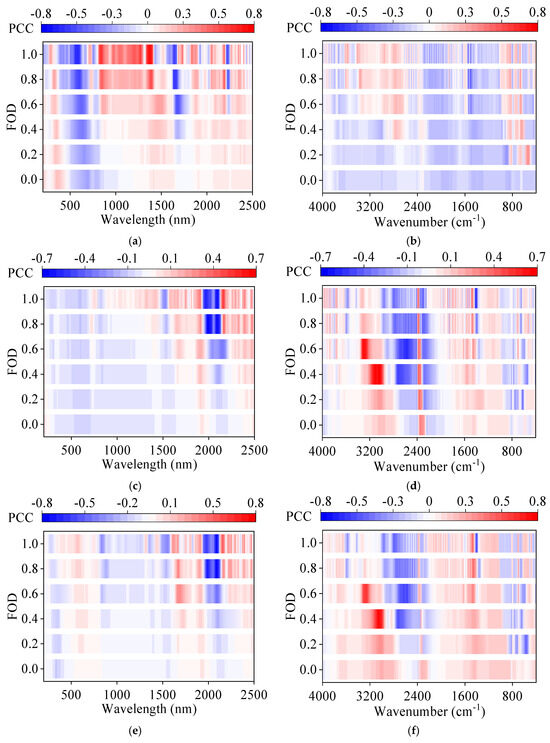 An estimation model utilizing PLSR was developed to predict key property contents based on full-spectrum 0–1st order (0.2-order interval) derivatives, with the results outlined in Table 2 and Table 3, which attached the values of PCFs for each PLSR model. The findings demonstrate that all FOD transformations led to varying degrees of enhanced model accuracy compared to the original reflectance (order = 0), indicating the efficacy of FODs in mitigating baseline interferences while amplifying spectral characteristics. One of the most noteworthy is the PLSR model, built on UV-Vis-NIR spectral data transformed by the first-order derivative, which exhibited the highest predictive accuracy, showcasing improved R2 values and reduced RMSE in the test set when contrasted with the original reflectance spectra. Similarly, the PLSR model utilizing MIR spectral data subjected to 0.6th-order derivative preprocessing showed the highest prediction accuracy, with enhanced R2 values and reduced RMSE in the test set relative to the original absorbance spectra. To delve deeper into the property estimation mechanisms across different FOD preprocessing methods, the correlation trends between full-band spectra and each property content at various FOD levels were scrutinized. The Pearson correlation coefficient (PCC) was utilized to quantify the strength of the linear relationship between spectral features and soil properties. The closer the PCC’s absolute value is to 1, the stronger the correlation. This analysis is detailed in Figure 5, offering insights into the relationships between spectral features and property content variations.