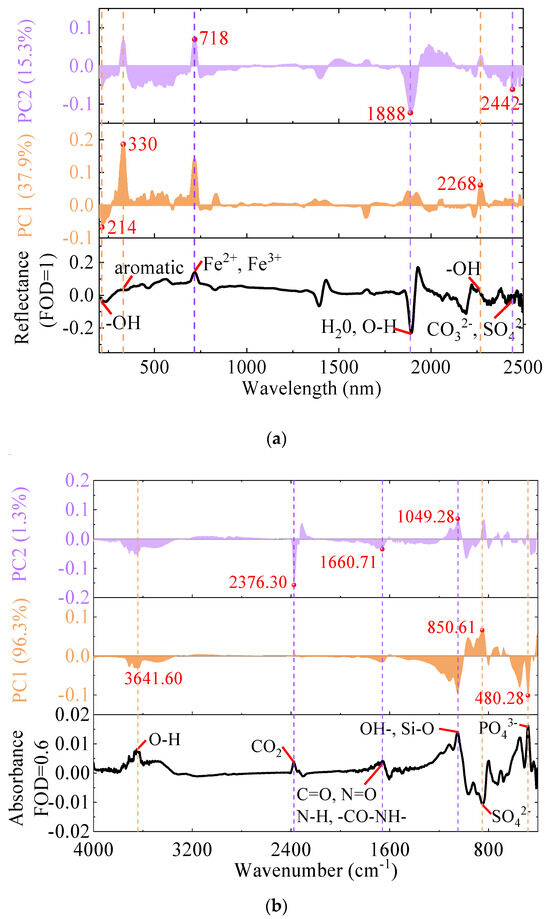 The results of the PCA transformation within the selected wavelength range are depicted in Table 4 and Table 5, showcasing the number of PCs derived and the contribution rate of each component. In the UV-Vis-NIR spectral domain, the initial 12 PCs extracted post-differentiation encapsulate 90.21% of the total variance. Transitioning to the mid-infrared spectrum, the cumulative contribution of the first five PCs delineates 99.18% of the total variance within the empirically observed spectral data order of 0.6. Figure 6 presents the contributions of the first two principal components alongside the bands of the observed corresponding peaks, following the PCA transformation conducted within the selected wavelength ranges encompassing UV-Vis-NIR and MIR spectra.