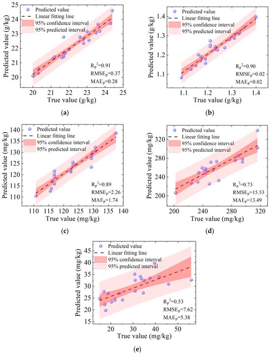 Based on the output of the point prediction model, OPA-PLSR, on the testing set, we present a visual representation of the true and predicted values of soil properties in a fitting graph, as depicted in Figure 7. The fitted line is derived using parameters obtained from the least squares method, a widely used approach in regression analysis that minimizes the sum of the squares of the residuals. The coefficient of determination, R2, serves as a statistical measure that quantifies the degree of agreement between the fitted line and the actual data points. A higher R2 value indicates a stronger correlation, reflecting a closer alignment between the data points and the fitted line.