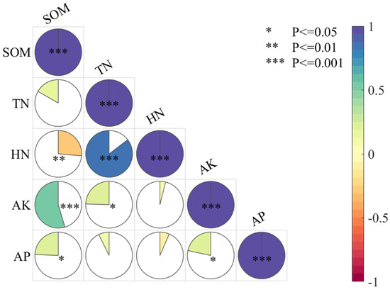 Heat map of the correlations among soil properties. Note: the absolute values of the PCCs are positively associated with the proportion of filled colors within the circle.