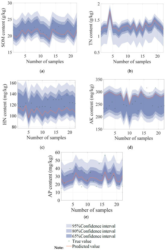 Utilizing the optimal OPA-PLSR model, we used the point errors in the validation set to perform interval predictions. Table 7 presents the outcomes of the Gaussian interval predictions and KDE interval predictions across different confidence levels (95%, 80%, and 65%). The analysis reveals that for SOM, TN, HN, and AK, the PICP obtained through both the Gaussian and KDE methods basically reached the specified confidence levels. This highlights the robustness of the predictions, as it shows that the actual values are highly likely to fall within the predicted intervals. Moreover, the PINAW index indicates that the width of the KDE-generated intervals is generally narrower compared to those produced by the Gaussian method at the same confidence level. For instance, at the 95% confidence level, the PINAW for SOM is 1.7894 for the KDE interval, compared to 1.7591 for the Gaussian interval. A similar pattern is observed for TN, HN, and AK, where the KDE method consistently produces tighter prediction intervals. Focusing on SOM, as a representative case, the KDE method achieved a lower CWC at the 95% confidence level, further demonstrating its advantage in precision. This finding suggested that KDE provided a narrower prediction interval while maintaining prediction accuracy, offering more precise and actionable insights for the management of SOM, TN, HN, and AK contents. This reduction in interval range minimizes the risks associated with decision making and enhances resource utilization efficiency, thereby supporting more effective agricultural practices. In contrast, the PICP for AP fell significantly short of the specified confidence level, indicating that the prediction interval failed to encompass the true values at the expected frequency. In the context of the point prediction results, the accuracy for AP was notably lower compared to the other properties. This suggests that a higher degree of regression error is often associated with the index of poorer interval prediction in interval modeling. These findings highlighted a notable shortcoming in both the Gaussian probability interval prediction and KDE interval prediction methodologies. It is essential to emphasize that these approaches were insufficient in accurately capturing the inherent variability and fluctuations in the actual values of AP. While the precision of the prediction outcomes fell short of optimal levels, the interval prediction of AP offered an initial evaluation of its concentration, serving as valuable information to guide subsequent soil testing and in-depth analysis.