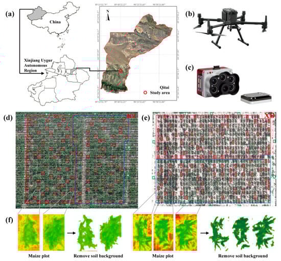 Location and design of study area. (a) Location of the study area; (b) DJI Matrice 300 RTK quadcopter; (c) MicaSense RedEdge-P multispectral sensor; (d) RGB map and design of KZ shows the 100 selected plots (red squares) for situ measurements, nine ground control points (green squares), and two replications (red and blue borders); (e) RGB map and design of XD, display content is the same as (c); (f) removed soil background from maize plot.