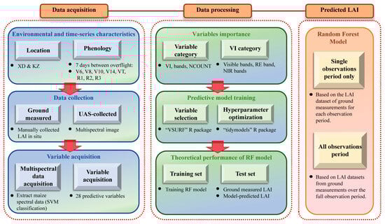 Figure 2 shows the LAI estimation framework outlined in this study. Pix4DMapper software (version 4.0, Pix4D S.A., Prilly, Switzerland) was used for image preprocessing. Subsequently, the preprocessed images were geo-calibrated using ArcMap software (version 10.8, EsriInc., Redlands, CA, USA), resulting in the generation of an orthographic image map of the field. For accurate extraction of maize spectral data, maize parts were segregated from the soil background (Figure 1f). An SVM classification performed using ENVI software (version 5.3, EXELIS., Boulder, CO, USA) was used to identify and extract maize pixels [19]. The SVM tool parameters were set to the default values (i.e., gamma in kernel function = 1, penalty parameter = 100, pyramid levels = 0, and classification probability threshold = 0). Based on ground truth data, the Kappa coefficients of the SVM classifications for all UAV imagery were >85%. Plot-level data extraction involved defining individual plot boundaries from orthographic images with an assigned plot ID corresponding to the maize inbred lines.