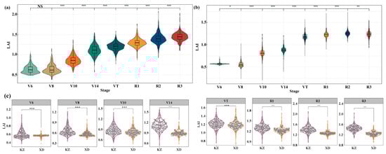 Violin plots of maize LAI using the RF model on (a) KZ field and (b) XD field. The horizontal axis represents different observation periods. (c) Comparison of maize LAI between KZ field and XD field in different observation periods. The central short line represents the median value. *, ** and *** are significant correlation at p < 0.05, p < 0.01, p < 0.001, respectively. NS: not significantly different.