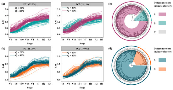 Principal component analysis (PCA) and cluster analysis of maize LAI change on KZ field (a,c) and XD field (b,d). Q, quantile. Different colors indicate clusters.