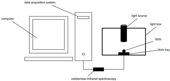 The Vis/NIR spectroscopy non-destructive testing platform used in this study was custom-built and primarily consisted of an Ocean Optics QE Pro Vis/NIR spectrometer (Ocean Insight, Orlando, FL, USA) with a spectral range of 400–1100 nm, a litchi holder, a 10 W halogen lamp, and a computer. To ensure the stability and consistency of the spectral data, an opaque holder was designed to securely position the litchi and minimize interference from external light sources.
