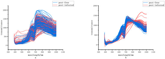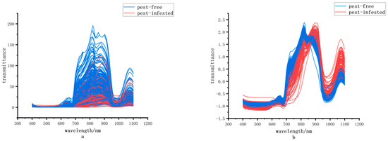 To minimize the impact of scattering on the spectral data, data preprocessing techniques such as standard normal variate (SNV) and multiplicative scatter correction (MSC) were applied. After noise reduction, the spectral differences between infested and non-infested litchis became more distinct. This preprocessing step effectively mitigated environmental and surface scattering effects, enhancing the differentiation between infested and non-infested fruits and revealing more significant biochemical variations. These findings suggest that by analyzing specific spectral features, we can effectively distinguish between infested and non-infested litchis, providing robust support for non-destructive detection technologies.