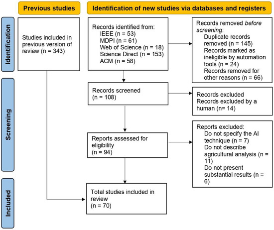 To select the articles that make up this review, the protocol followed the research lines of Siqueira et al. [23], Kitchenham [24], and Page et al. [25] (PRISMA). The selection of articles followed the following inclusion (I) and exclusion (E) criteria: (I1) articles that used AI techniques for agricultural analysis; (I2) complete articles written in English; (I3) articles from peer-reviewed journals; (E1) articles that did not describe the type of agricultural analysis used; (E2) articles that did not specify the AI technique used and that were incomplete or abstract; and (E3) articles that did not present substantial experimental results.