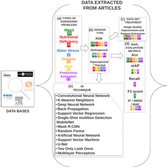 Flowchart of the systematic literature review data extraction and sequence highlights, adapted from Siqueira et al. [23]. Data extraction steps: (a) list of articles divided by the type of agronomic problem that each proposed to solve; (b) list of articles, divided by type of agronomic problem, that used sensors to acquire the dataset; (c) list of articles, divided by type of agronomic problem, that used image improvement techniques in the dataset; (d) number of articles that used evaluation metrics; (e) list of the main machine learning models used by each article in this study.