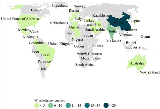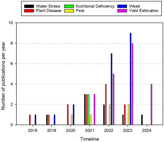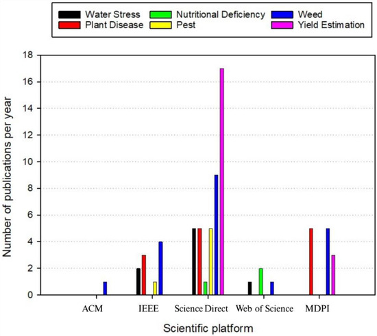 Initially, the terms “Weed”, “Nutritional Deficiency”, “Water Stress”, “Disease”, “Pest”, and “Yield Estimation” were used to search relevant articles to find a satisfactory search keyword. Search filters were added with the inclusion of the terms “Machine learning OR Deep Learning” to refine the search. The term “UAV” was added to filter only articles related to images captured by UAVs. The full search strings were as follows: ((Weed) AND (“Machine learning” OR “Deep Learning”) AND (“UAV”)); ((Nutritional Deficiency) AND (“Machine Learning” OR “Deep Learning”) AND (“UAV”)); ((Water Stress) AND (“Machine Learning” OR “Deep Learning”) AND (“UAV”)); ((“Disease”) AND (“Machine Learning” OR “Deep Learning”) AND (“UAV”)); ((Pests) AND (“Machine Learning” OR “Deep Learning”) AND (“UAV”)); ((Yield Estimation) AND (“Machine Learning” OR “Deep Learning”) AND (“UAV”)). Other keywords such as “Artificial Intelligence”, “Precision Agriculture”, “Agronomic Problems”, and “RGB” were tested, but did not add results to the search. Finally, the articles were extracted from the following scientific databases: Association for Computing Machinery—ACM [26], Institute of Electrical and Electronic Engineers—IEEE [27], Science Direct [28], Multidisciplinary Digital Publishing Institute—MDPI [29], and Web of Science [30].