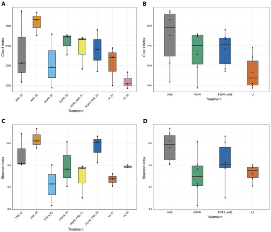 Alpha-diversity analyses of three biostimulant treatments, ANE, PGPR, and PGPR-ANE, along with control, during both tillering (S1) and harvesting (S2) stages using Chao1 (A,B) and Shannon (C,D) indices. (A,C) Analysis of each stage and treatment separately. (B,D) Combined analysis of both stages within each treatment.