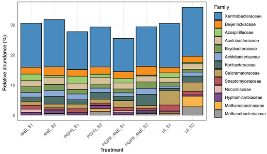 The bacterial communities in the rhizosphere soils of rice treated with ANE, PGPR, and PGPR-ANE biostimulants were predominantly composed of the phylum Pseudomonadota, with relative abundances of 32.8%, 29.9%, and 28.3%, respectively (Figures S3 and S4). In contrast, the control treatment was mainly dominated by the phylum Bacillota (34.0%), followed by Pseudomonadota (27.5%) and Actinobacteriota (14.2%). At the family level, all biostimulant treatments resulted in higher relative abundances of PGPR-associated families compared to the control, including Xanthobacteraceae, Beijerinckiaceae, Azospirillaceae, Acetobacteraceae, Acidobacteriaceae, Streptomycetaceae, Nocardioidaceae, and Hyphomicrobiaceae. Notably, the relative abundances of these bacterial families increased from the tillering to harvesting stages. For example, the relative abundance of Xanthobacteraceae increased from 14.7% to 15.7 (ANE), 12.6% to 13.3% (PGPR), and 11.0% to 13.2% (PGPR-ANE) between the tillering and harvesting stages (Figure 2). Similar trends were observed for Beijerinckiaceae, Acetobacteraceae, Acidobacteriaceae, and Hyphomicrobiaceae. However, some bacterial families, such as Azospirillaceae, Streptomycetaceae, and Nocardioidaceae, showed a decrease in relative abundance from the tillering to harvesting stages. Additionally, families like Bryobacteraceae, Koribacteraceae, and Caloramatoraceae, known for their roles in nutrient cycling, play a crucial role in the turnover of organic plant material. For example, Koribacteraceae increased from 1.4–1.5% to 2.3–3.7%, supporting overall soil ecosystems by contributing to the decomposition process and maintaining microbial diversity. Remarkably, our study found a relatively low abundance of methanogenic bacterial families, Methanosarcinaceae (0.03–0.05%) and Methanobacteriaceae (0.01–0.06%), with less than 1% relative abundance in biostimulant treatments. In contrast, these methanogenic families were more prevalent in the control treatment during both the tillering and harvesting stages, with Methanosarcinaceae ranging from 0.4% to 3.5% and Methanobacteriaceae from 0.6% to 2.8% (Figure 2).