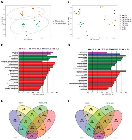 Comparative microbial community in rice rhizosphere soil across growth stages and treatments. (A) PCoA of microbial communities at tillering and harvesting stages. (B) PCoA of microbial communities by treatment at tillering stage (S1) and harvesting stage (S2). (C,D) LEfSe analysis highlighting differential abundances of taxa across treatments at tillering (S1) and harvesting (S2) stages. (E,F) Venn diagram of shared and unique families at tillering (S1) and harvesting (S2) stages across treatments.