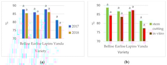 The percentage of obtained sweet cherry maiden trees depending on the year (a) and the method of propagation (b). Means marked with the same letters within individual varieties do not differ significantly at the level of α = 0.05, using Duncan’s test.