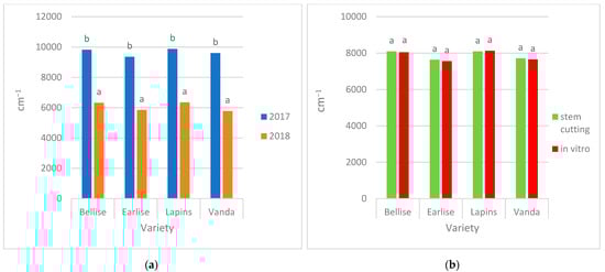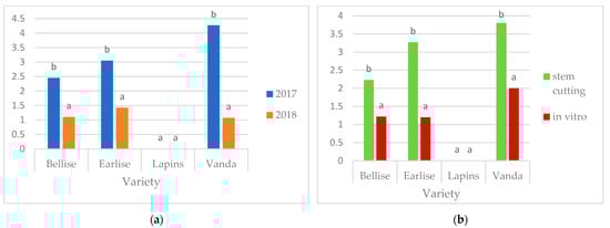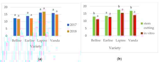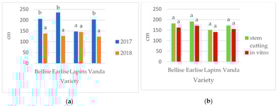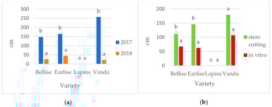 In half of the cases, the interaction between the two factors had a significant impact on the number and total length of side shoots (Table 1). In the first year of study, three varieties (‘Bellise’, ‘Earlise’, ‘Vanda’) exhibited a significantly greater number and length of side shoots (Figure 4a and Figure 5a). For these same three varieties, both the number of side shoots, and for two varieties (‘Bellise’ and ‘Earlise’), the length of side shoots, were significantly higher when rootstocks were propagated by shoot cuttings (Figure 4b and Figure 5b).