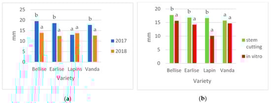 The diameter of obtained sweet cherry maiden trees depending on the year (a) and the method of propagation (b). Means marked with the same letters within individual varieties do not differ significantly at the level of α = 0.05, using Duncan’s test.