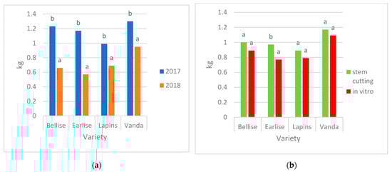 The fresh mass of leaves of sweet cherry maiden trees depending on the year (a) and the method of propagation (b). Means marked with the same letters within individual varieties do not differ significantly at the level of α = 0.05, using Duncan’s test.