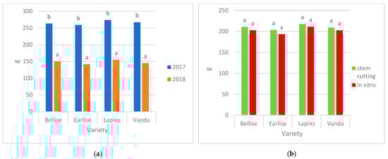 The fresh mass of sweet cherry maiden trees depending on the year (a) and the method of propagation (b). Means marked with the same letters within individual varieties do not differ significantly at the level of α = 0.05, using Duncan’s test.