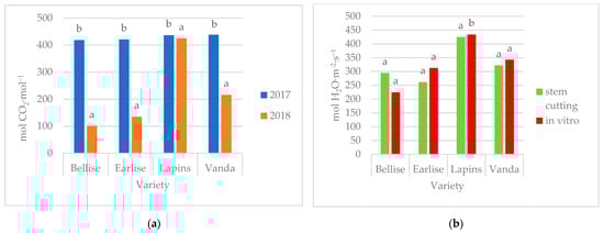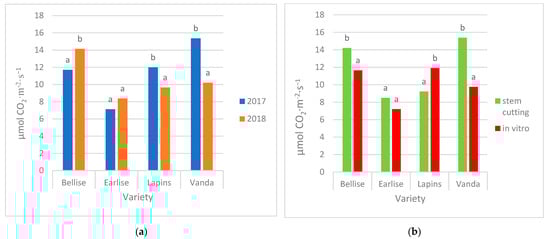 Net photosynthetic intensity depending on the year (a) and the method of propagation (b). Means marked with the same letters do not differ significantly at the level of α = 0.05, using Duncan’s test.
