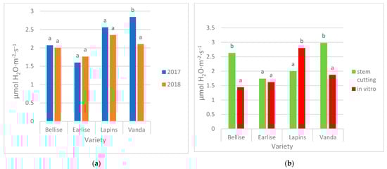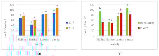 The stomatal conductivity depending on the year (a) and the method of propagation (b). Means marked with the same letters do not differ significantly at the level of α = 0.05, using Duncan’s test.