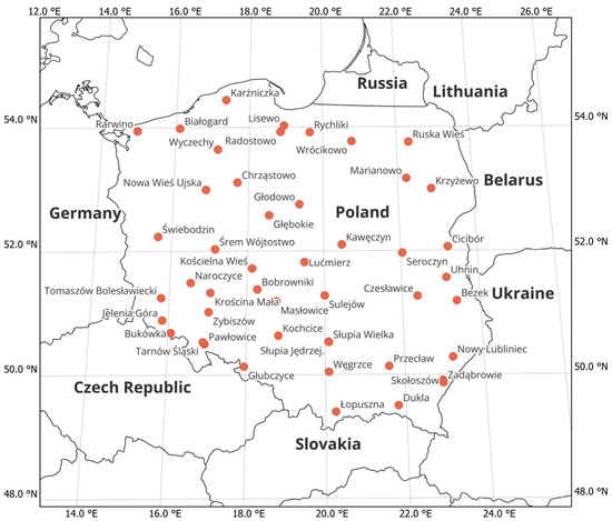 Experiments were conducted in 47 locations across Poland between 2009 and 2022 (Figure 1). The following species were studied: winter and spring wheat, winter and spring barley, and winter triticale. Each species was represented by one cultivar: spring barley—Radek, spring wheat—Mandaryna, winter barley—Zenek, winter triticale—Rotondo, and winter wheat—Linus. Those cultivars were selected because they were studied for the longest period. Yield data were collected from the Research Centre for Cultivar Testing (COBORU, Słupia Wielka, Poland) [27], which assesses yield and other traits of newly released cultivars through multi-environment trials. This study utilized data from trials conducted under two different levels of input intensity, a1 and a2. The moderate input level (a1) included moderate mineral fertilization with nitrogen, phosphorus, and potassium tailored to each location, herbicides and insecticides, and seed treatment. The high input level (a2) included additionally 40 kg ha−1 year−1 of nitrogen, foliar fertilization, fungicides, and growth regulators, which were not used under moderate input conditions. Each experiment’s crop planting dates, plant density, and NPK fertilizer rates followed common regional practices. Tillage operations and weed and insect management were decided independently in each location. Based on data provided by COBORU, the sowing and harvesting dates for the studied cereals vary across different regions in Poland due to differences in climatic conditions and local agricultural practices. The approximate dates for sowing of winter triticale were from late September to early October and harvesting from late July to early August. Winter wheat was typically sown between mid-September and early October and harvested from late July to mid-August. Winter barley was usually sown in early to mid-September and harvested in early to mid-July, making it one of the earliest cereal crops to be harvested. In northern Poland, the sowing may be slightly delayed due to cooler autumn temperatures and the higher risk of early frost, while in southern regions, it can occur earlier, where autumn conditions are milder. Spring wheat was generally sown from the end of March to early April, depending on soil temperature and weather conditions, and harvest took place from late July to early August. Spring barley was sown from late March to early April once the soil had sufficiently warmed and typically harvested from late July to early August. In western Poland, where spring arrives earlier, sowing can start in late March, while in cooler eastern regions, it may be delayed into early April. The experimental design in each location was a randomized complete block design with three replications. The plot size was 15 m2.