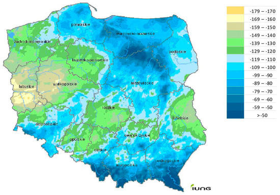 The experimental locations captured major cereal production regions in Poland and included various soil and weather conditions. Weather conditions were analyzed from 1 April (average emergence date) to 30 July (average end of grain filling date) using CWB values individually for each of the 47 locations and studied years. The exemplary map for CWB1 (21.03–20.05) for 2020 is shown in Figure 2. In the study, three CWBs for each year were used: CWB1 (21.03–20.05), CWB4 (21.04–20.06), and CWB7 (21.05–20.07) [28,29].