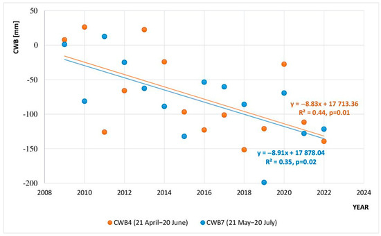 Regression analysis for mean CWB (Climatic Water Balance in mm) across all locations presenting changes over the study period (2009–2022). The orange line represents the trend for CWB4 and the blue one for CWB7; R2 is the coefficient of determination, and both p-values suggest a statistically significant downward trend (at a significance level of 0.05).